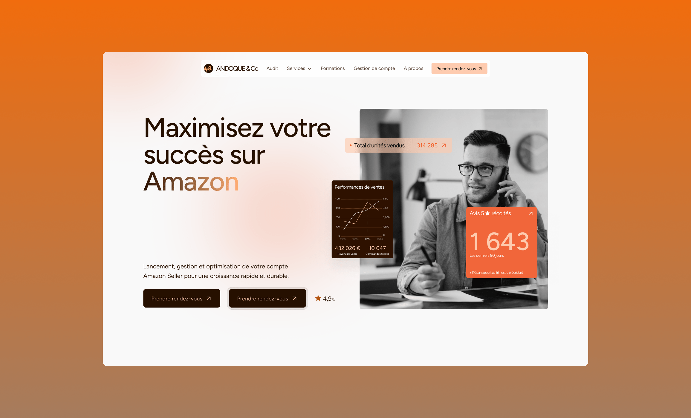- Clarifier la proposition de valeur : “Une agence française experte Amazon qui vous accompagne de A à Z, avec un vrai focus performance.”